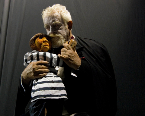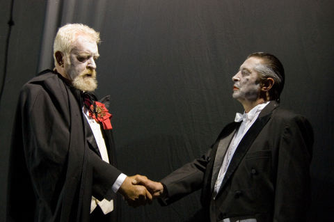 Közben a szobán zajtalanul, szinte szellem módra át–átsuhanó szobapincér (id. Bessenyei István) tesz–vesz, leszedi az asztalt, megigazítja, majd egy–egy bűvész–módon előhúzott, hatalmas fehér szalvétával takarja le először a bábokat, végül pedig időközben elszenderedett — vagy meghalt? — gazdájukat is. Az eleinte még valóságnak tűnő látvány percről percre válik egyre sejtelmesebbé, látomásosabbá. Emberek? Bábok? Szellemek ezek? Egyáltalán, milyen is ez a javarészt önként választott, egy életformával még a családosoknak is együtt járó magány? Mire a hang– és fényeffektusok, színpadkép és játék kikapcsolja valóságérzékünket, a válasz is megjön és a csomagok elhelyezésére kér utasítást a szobapincér másodpéldánya képében. Akkor most melyikük az élő? Hát a kísértet? És mi a helyzet a mi, nyolcvan évvel későbbi báb–életünkkel, magányunkkal? Félóránk volt szembenézni vele, de elfelejteni hónapok kellenek…