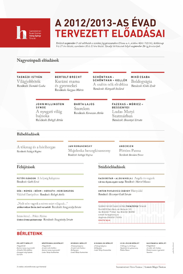 Társulatunk a Tasnádi testvérek nevéhez kapcsolódó Világjobbítók című előadással nyitja a 2012/2013-as színházi évadot. Ezt a produkciót a társulat fiatal rendezője, Vargyas Márta munkája követi, aki a híres német drámaíró, Bertolt Brecht Kurázsi mama és gyermekei című zenés darabját viszi színre. Idén ismét lesz szilveszteri zenés bohózat a szatmári színházban, amelyet a frissen szerződött Kányádi Szilárd színész-rendező állít színpadra. A szabin nők elrablása nem csak a szilvesztert színházzal ünneplők számára lesz elérhető, ugyanis a korábbi évek hagyományaitól eltérően a produkciót januártól bérletben is játsszuk.