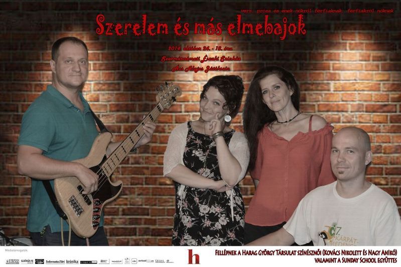 Versben, prózában és dalban mesél a szerelemről, a férfi-nő bonyolult kapcsolatáról a Harag György Társulat két művésze, Kovács Nikolett és Nagy Anikó, hangszeren kíséri őket a Sunday School (Henter Ambrus és Botos Norbert) együttes 2014. október 24-én, pénteken, 18 órától a Szatmárnémeti Északi Színház Ács Alajos stúdiótermében. Belépők a színház jegyirodájában válthatók 15 lejes egységáron hétköznaponként 10 és 17 óra között.