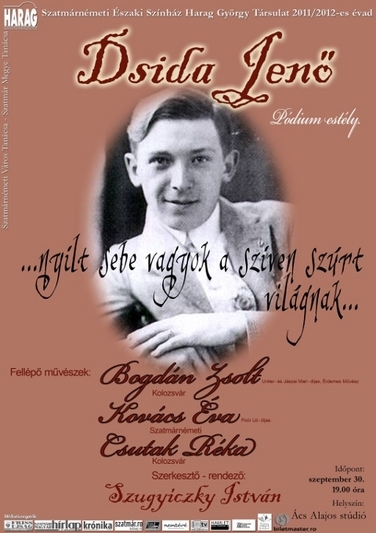 „Az egyetemes magyar irodalom egyik állócsillagát idézzük meg a Szatmárnémeti Északi Színház Ács Alajos Stúdiótermében. Kivételes képességű költő, nagy tehetséggel megáldott, érzékeny lélek. A kínok, bajok roncsolták testét, de szellemét csiszolták, és költészetét igazgyöngyökké nemesítették” – vallják az alkotók Dsida Jenőről.