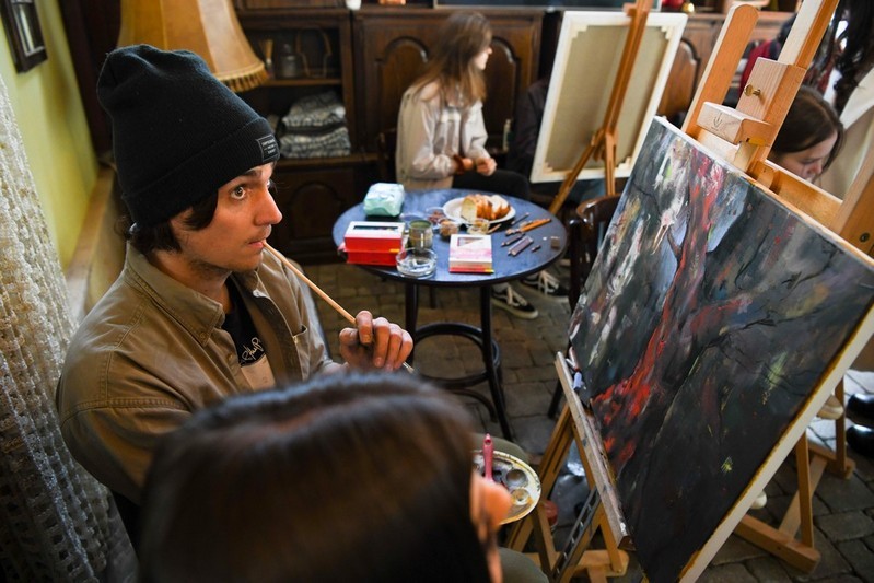 Amíg a szórakozóhely belső terében zajlottak az események, addig a teraszon sem állt meg az élet. Sőt! Kófity Annamária és Nagy Tamás bábszínészek a kora délutáni órákig gyerekekkel tartottak különböző foglalkozásokat, mellettük pedig képzőművészek alkottak: Nemes Nagy Ágnes Szomj című verséből ihletődve ragadott ceruzát vagy festőecsetet és vitte vászonra benyomásait Nagy Gabriella, Bántó Fanni, Simionaş Varga Anna, Balog Tamás és Erdei Máté. A későbbi órákban pedig az elkészült képeket a helyszínen el is árverezték, a bevétellel pedigukrajnai bajbajutottakat támogat a társulat. Szintén az árverésen kelt el Sălăjan Kinczel Mircea festménye is. Ő egy József Attila portrét vitt vászonra és ajánlotta fel külön, ugyancsak jótékonysági célra.
