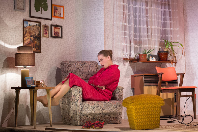 A díszlet precízen megkomponált realista tér (tervező: Hajdu Bence), egy hetvenes évekbeli lakásbelsőt látunk színes, felfújt üveghallal, pálmafás poszterrel, piros műbőrfotellel, dísztányérokkal. Vannak szobanövények is, az egyik félig elszáradt már, és ez nagyon szépen mesél az itt lakók depressziójáról. Akárcsak a feleséget, Kadrit játszó Páder Petra arca, aki már akkor egy fotelben kuporog a színpad baloldalán, amikor elfoglaljuk a helyünket a nézőtéren. Mint gyorsan kiderül, részeges férjét várja haza (Lengyel Benjámin e.h.), akinek a szülei vacsorára érkeznek majd hozzájuk.