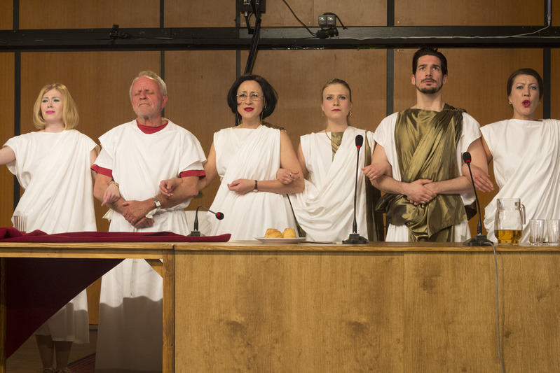 Polgár Csaba az élő tyúkoktól kezdve a basszusgitárral feszítő Aemiliuson keresztül a Bee Gees To Love Somebody című számáig sok ötletet rak bele az előadásba, de ezek még nem érnek teljesen össze, ahogy a sok helyről hozott színészgárda összjátéka sem működik elég olajozottan. Lukáts Andor, Bánki Gergely és Némedi Árpád érzik talán a legjobban az önreflektív és szatirikus stílust; de vannak, akik még nem tudnak olyan karikatúraszerű alakokat megformálni, amilyeneket ez a groteszk komédia megkövetelne. Látszik, milyen akar lenni az előadás, de még nem olyan. Ha lesz rá elég idő, még összeérhet az, aminek össze kell.