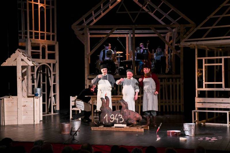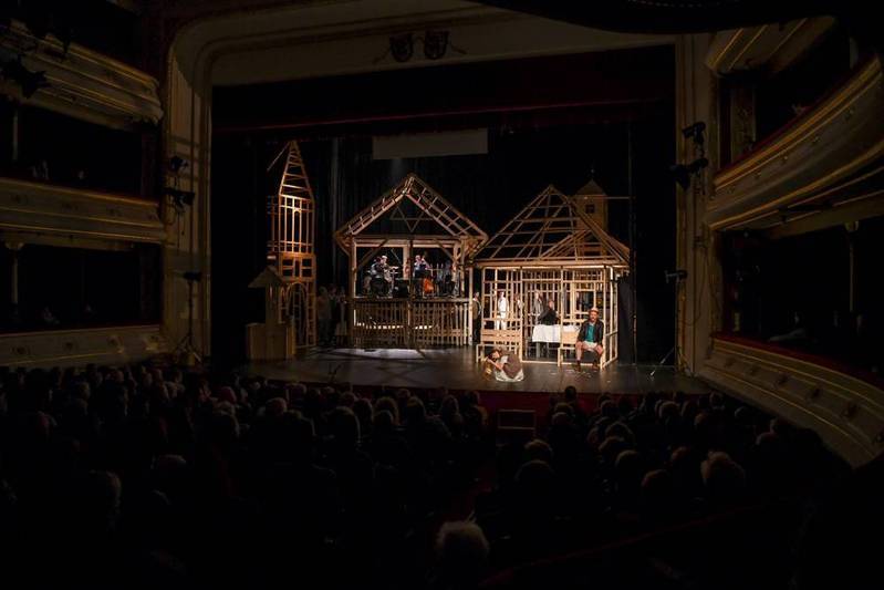 (A színpad elsötétül, miközben a harang zúgása hallatszik a háttérben.)