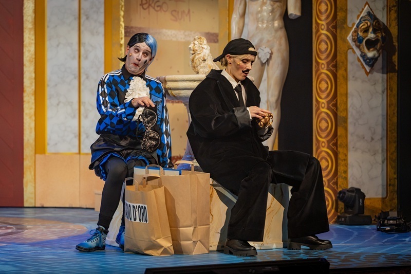 Máté elárulta, nagyon szereti azt a műfaji sokszínűséget, amit Kovács Lehel megteremtett a Két úr szolgája előadásban. Az eklektika közel áll hozzá az élet minden területén, talán éppen ezért érzi annyira jól magát Goldoni hősének bőrében. „Nagyon hálás vagyok azért, hogy műfajilag ilyen sokszínű lett ez az előadás. A feleségem úgy fogalmazott, hogy már az első jelenetnél elkapta a flow-t, ami végigvitte ezen az őrületes, sziporkázó, színes kavalkádon. Mai mondatok is vannak benne, ugyanakkor visszatérünk a régmúltra is. Az én Truffaldinómra is ez a műfaji sokszínűség jellemző, egy picit táncoskomikus, egy kicsit a kabaréból a konferanszié, de ugyanakkor az a keserű bohóc is, akitől elhangzik pár őszinte mondat, amikor lehull a maszk. Nagyon jó érzés egy színész számára, ha rábíznak egy ilyen feladatot.”
