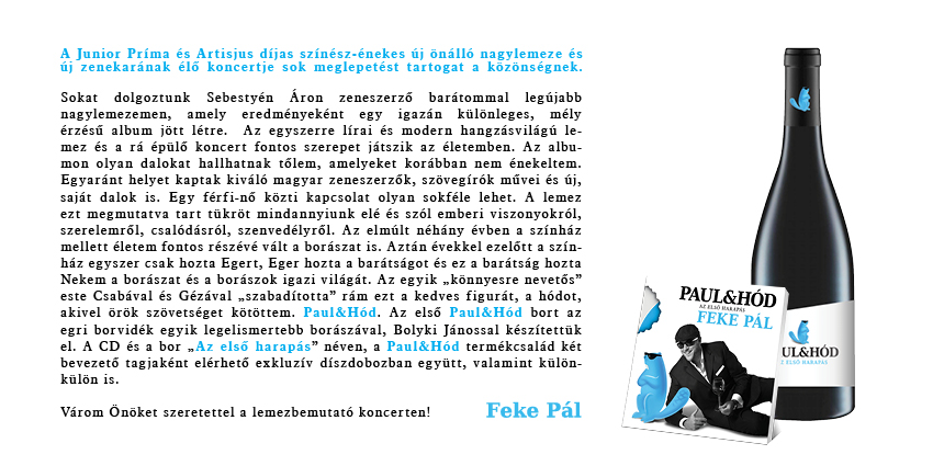 2013. január 13-án, este 7-kor Feke Pál lemez bemutató koncertjét láthatják, PAUL&HÓD - Az első harapás címmel. A művész december 15-én délután 5 órától 6 óráig exkluzív dedikálást tart színházunk előcsarnokában. Ha december 16-ig megvásárolja jegyét a koncertre, a dedikáláson 15% kedvezményt kap a CD és a bor árából. Jegyek már kaphatók a színház szervezési-és jegyirodájában.
