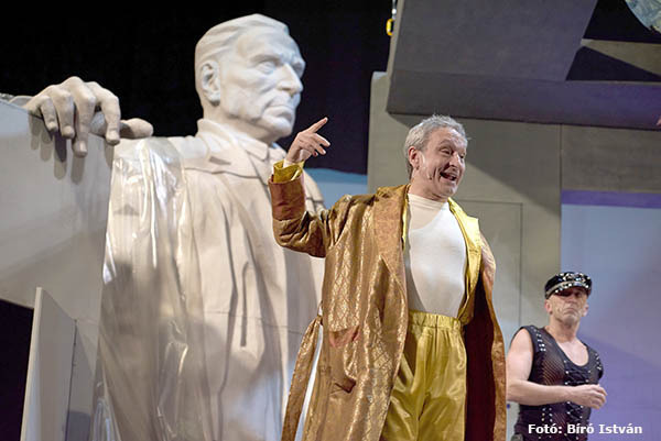 Kiss Borbála, az előadás díszlettervezője arról mesélt, hogy a díszlet kialakításakor a bizánci vonal és a ’80-as évek hangulatának együttes megjelenítésére törekedtek, amely leginkább a monumentalitásban érhető tetten: „Amit mindenképp szerettem volna megmutatni, az az a feszültség, amely abból fakad, ahogyan az emberek alkalmazkodnak ezekhez a monumentális elemekhez. Valójában ennek a feszültségnek a megjelenítése érdekelt a leginkább.”