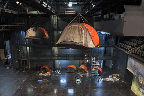 A karzat alól középen egy ember kúszik végig a földön, két karjával ütemesen húzva magát előre. Ő a rendező. Miután pólójával embernyi ösvényt törölt végig a padlón, odaül a többiek mellé, akik mintha észre sem vennék, majd egyikük kicsit megveregeti a vállát. Ennyi. Aztán ketten bukósisakot húznak, motorra ülnek és kihajtanak az egyik kulisszakapun az utcára. Még el sem kezdődött az "előadás", már véget vet neki valami egészen valóságosként megjelenő történés.