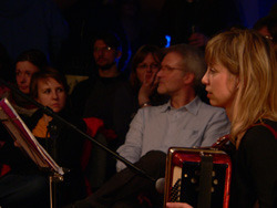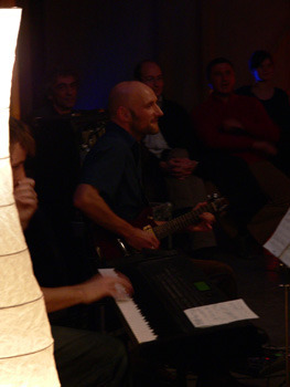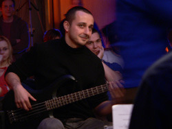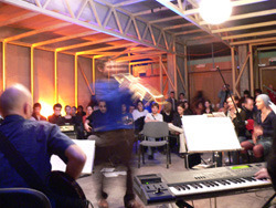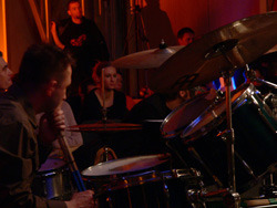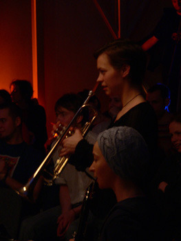 Szombat este van és ezúttal ingyenes a Krétakör SzínészTáncZenekar bemutató órája, úgyhogy el is várja az ember, hogy megteljen a Gödör Klub hátsó terme. Végül a nyolcas kezdés kicsit korainak bizonyul, hiszen a jó másfél órásra nyúló örömzene utolsó harminc percében mondhatjuk csak el, hogy egy tűt sem lehet leejteni - ekkor már vagy kétszázan lehetünk. Eleinte vagy hatvan-nyolcvan embernek játszik a nagy körben elhelyezkedő zenekar (Bánki Gergely - dob, Katona László - basszusgitár, Láng Annamária - klarinét, Péterfy Borbála - tangóharmonika, Sárosdi Lilla - trombita, Tóth Attila - szintetizátor, Werner Tilo - gitár) és a kör közepén királykék trikóban trombitáló Bozsóki Imre tanár úr, az est házigazdája. Bevezetésül elmondja, hogy az elmúlt öt napban elsősorban az elméleti továbbképzés illetve különféle ritmus- illetve stílusgyakorlatok álltak az órák középpontjában, s az este folyamán ezekből mutat be néhányat a zenekar. Az első szám a Columbo on Fifth Avenue nevet viseli, s a ma szokásos dúr- és mollhangnemektől eltérő rendszerű, a dór, a líd, a fríg, a lokriszi és a mixolíd egyházi skálák tanulmányozására szolgált. A fúvósvonalra épülő, párhuzamos kvartokkal dolgozó, leginkább a modális jazz műfajába sorolható, Miles Davies Kind of Blue-jára hajazó számot aztán a Tanár Úr mindjárt az elején újra indítja, ezzel feloldva zenészeit a megfelelés kényszere alól - most már ez is csak olyan óra, mint a többi, lehet hibázni, majd kijavítják. Mo's Groove-ként aposztrofálja aztán a második számot - bár rögtön megjegyzi, hogy a legnehezebb feladat egy számnak nevet adni -, melyet Moritz nevű barátjával komponált még valamikor régen. Ez a mű tehát nem helyben született, fő eleme egy basszus figura, a ritmikai nehézséget pedig az adja, hogy az 1-ek mindig ki vannak hagyva belőle. Ha műfaját kéne meghatározni, leginkább a hatvanas-hetvenes évek funkyjához hasonlítaná. A nem túl barátságos címet viselő Führerbunker számot "próbatermünknek szenteltük" - magyarázza a zeneszerző, alighanem a Nemzeti Gödör betonfalaira utalva. Nekem pedig eszembe jut a kísértetiesen hasonló londoni Barbican, Európa egyik legnagyobb kulturális központja, melyről tudom, hogy a hidegháborúban az angolok első számú atombunkeréül szolgált, noha erről az odajáróknak többnyire sejtelmük sem volt. A Führerbunker balkáni skálára, balkáni, 7/8-os ritmusban íródott - gyengébbeknek szóló megfogalmazásban "nehéz rá tapsolni". Alighogy elkezdik, Bozsóki Tanár Úr már le is állítja, markánsabb belépésre és bátrabb játékra buzdítva zenészeit. Péterfy növendék nem átall visszafeleselni: "azt mondtad, hogy halkan játsszuk", de meg is kapja rá a választ: "halkan, de határozottan". A középrészben aztán egy ritmusváltást csak harmadik rászámolásra sikerül elkezdeni, majd újabb szünet következik: "hé, nekem is van szólóm!", a két trombitás leáll vitatkozni, "ez már kezd kínos lenni" - de a szemmel láthatólag nehéz feladat megoldását a végén aztán még dörgőbb tapssal jutalmazza a közönség.Ezután két magyar népdal sajátos feldolgozása következik: először a Tavaszi szél vizet áraszt 7/8-os ütemváltozatát hallhatjuk - a ritmusszekció kibővül: Tilo kolompol, Gergőt reszelőt teker és csörgőkarikázik, Bori tikfára vált, ha jól látom, de sajnos ő nekem háttal ül, úgyhogy nem lehetek biztos a dolgomban. Jópofa szám kerekedik a jól ismert népdalból, melyet talán ma is elsőként tanul meg az ember az óvodában. "Az ötlet bevált - meséli a mester - , vérszemet kaptunk, de a következő próbálkozásba belebuktunk, ezt is megmutatjuk." A "Ha felmegyek a budai nagy hegyre" kezdetű nótának kéne itt megszólalnia, de már a dallamot se sikerül eltalálni, újra a Tavaszi szélbe fog valaki - aztán mégis végigjátsszák a másik népdalt is, "hadd fájjon". Egy kis cím nélküli swing után az utolsó számot konferálja fel az est moderátora, s mivel tudja, hogy a Krétakörben szokás megadni a lehetőséget a közönségnek, hogy kérdezzen, e helyütt erre is lehetőséget kínál. Veress Panka dramaturg megkéri, hogy meséljen magáról valamit, hiszen a jelenlévők talán nem ismerik. Bozsóki Imre engedelmesen beszámol vajdasági születéséről, a grazi jazzegyetem szakról, mely elvben hat évig tart, ám amelyet ő három év után otthagy: "hat éves egyetem - ez nem normális dolog" és megosztja velünk legfontosabb linkjeit, a honlapja címét a http://www.myspace.com/imrelb -t és azt a helyet, ahonnan lemeze letölthető: (http://www.phonector.com/music.php?alb=100227&style= ). S miután kielégítette kíváncsiságunkat, beinti az utolsó jazzszámot is.