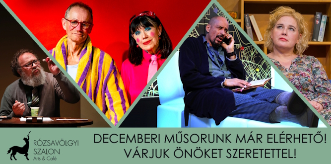 Decemberi műsorunk már elérhető! 2025. október 20.Értesítjük kedves Közönségünket, hogy a Rózsavölgyi Szalon december havi előadásaira megkezdtük az értékesítést. Jegypénztárunk elérhetősége >>> Online jegyvásárlás >>>