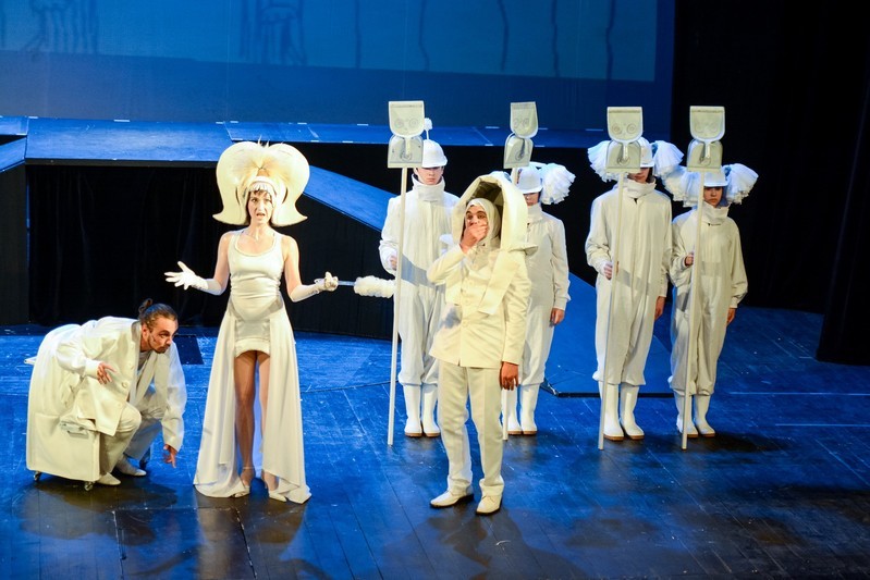 “Tíz évvel ezelőtt a Kaposvári Színművészeti Főiskolán dolgoztam ezen a darabon, ami színházi stílusában teljesen más, stúdióelőadás volt. Akkor döntöttem el, hogy amikor lehetőségem lesz rá, kipróbálom, hogy hogy működik nagyszínpadon. Nagy kihívás volt ez a munkafolyamat mindenkinek, színészeknek és nekem is, hiszen a látványra téve a hangsúlyt, olyan színészi bravúrokat kell végrehajtani, amelyek nem szokványosak a prózai színházban. Nagyon sok bábos elemet hoztam az előadásba, jelmezeket, maszkokat, melyek segítségével a mesejáték csodáját elevenítjük meg. A másik dolog, ami miatt ragaszkodom ehhez az előadáshoz, azok Presser Gábor dalai, amelyekben meseivé tette az addig megszokott stílusát”- mondja Nagy Regina, az előadás rendezője.