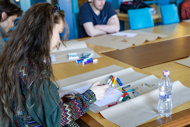 Szerdán a Katona József Könyvtárban „JELEN LENNI” néven futó workshop keretein belül dolgozhattak a fesztiválra érkező diákok mentálhigiénés segítő szakemberrel.