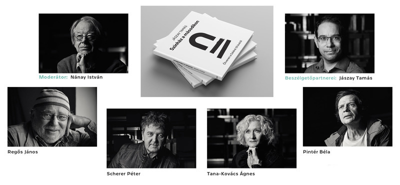 A moderátor - a Szkéné életét a kezdetektől követő - Nánay István, beszélgetőtársai a szerző Jászay Tamás, Tana-Kovács Ágnes művészeti vezető, a színházat 30 évig igazgató Regős János, a társulatának 23 évig otthont adó Pintér Béla és a már egyetemi éveit is itt töltő Scherer Péter.